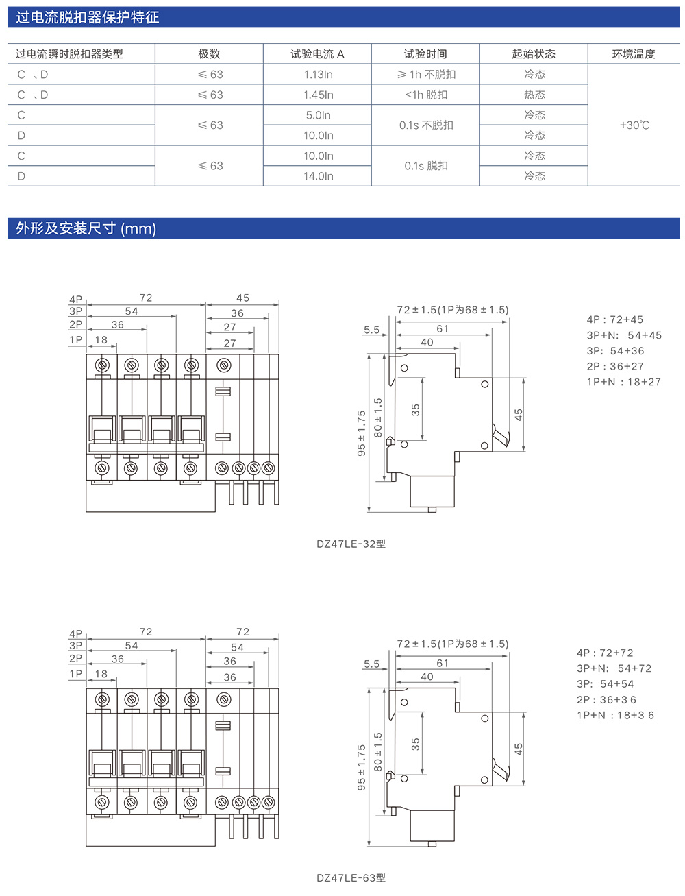 DZ47LE-63 系列漏電斷路器適用于交流 50Hz,額定工作電壓單極兩線、兩極 230V,三極、三極四線、四極 400V,額定電流至 63A 的線路中,用來對人進行間接接觸保護,以及對建筑物及類似用途的線路進行過電流保護。也可對由于過電流保護裝置不動作而持續(xù)存在的接地故障引起的火災(zāi)提供保護。帶過電壓保護的漏電斷路器還能對由于電網(wǎng)故障引起電壓過高進行保護。